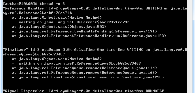 例如:thread -n 3输出最耗CPU的3条线程及堆栈;thread -b显示死锁线程。