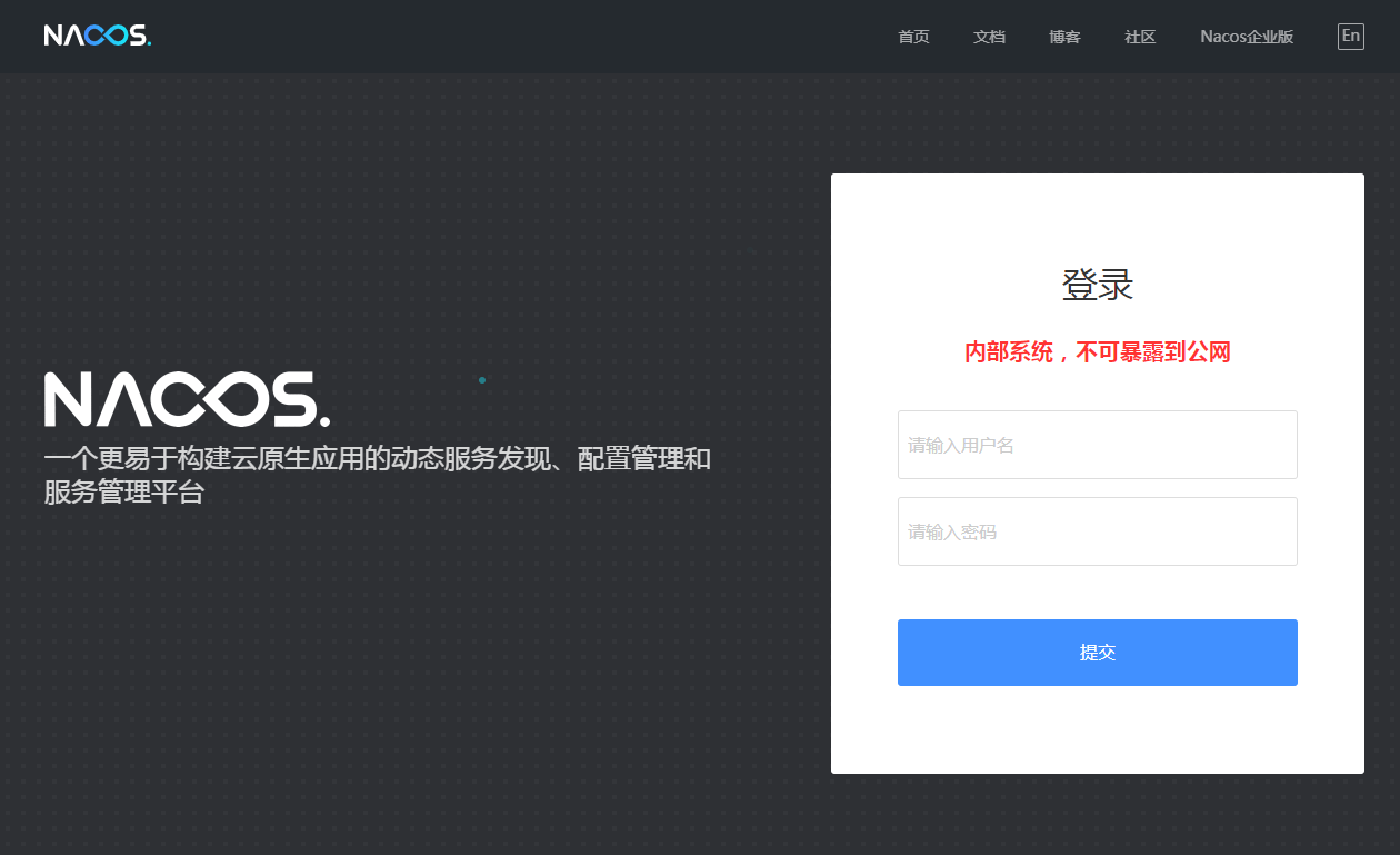Nacos是一个内部微服务组件,需要在可信的内部网络中运行,不可暴露在公网环境,防止带来安全风险。
