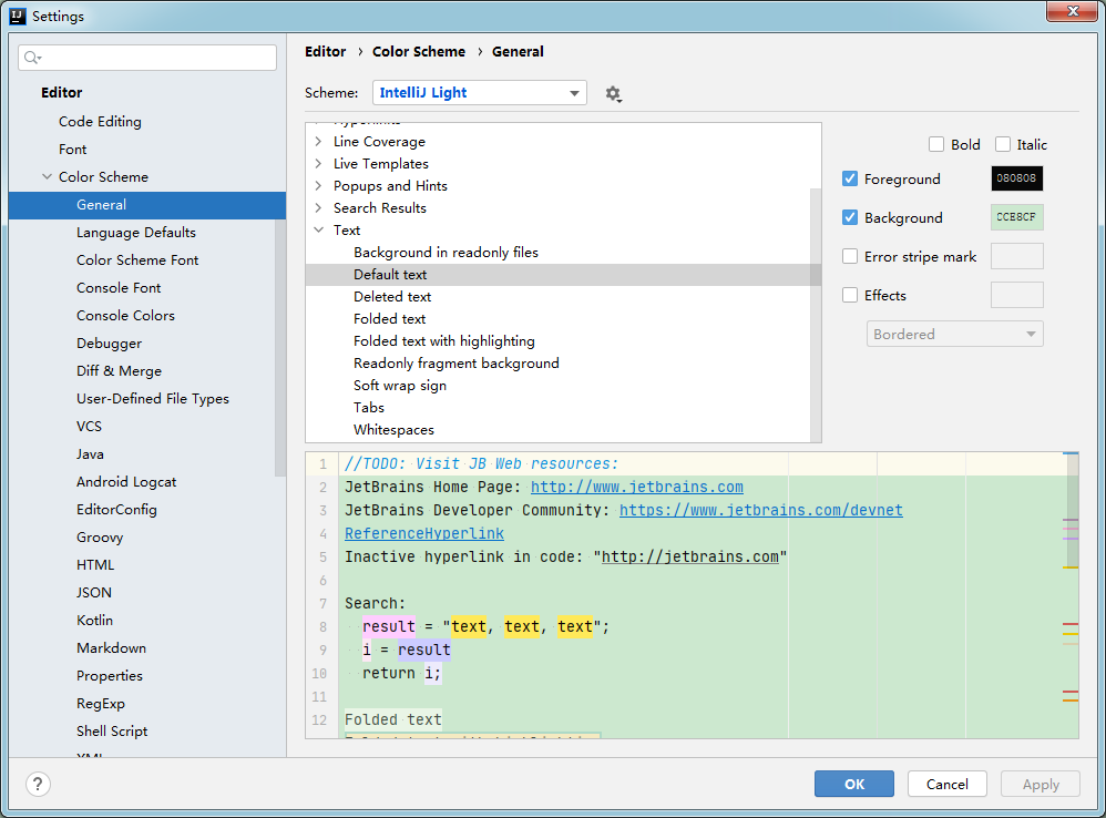 设置路径如下Settings → Editor → Color Scheme → General → Text → Default text,设置Background为护眼的豆沙绿颜色即可:#CCE8CF(RGB 204,232,207)。