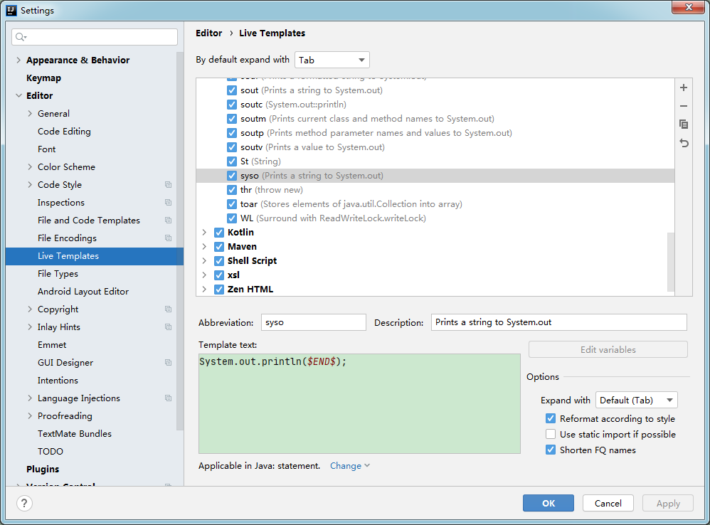 如果仍然想使用Eclipse的补全方式,可以在:Settings → Editor → Live Templates → output分组中复制一条,将Abbreviation设置为syso即可。