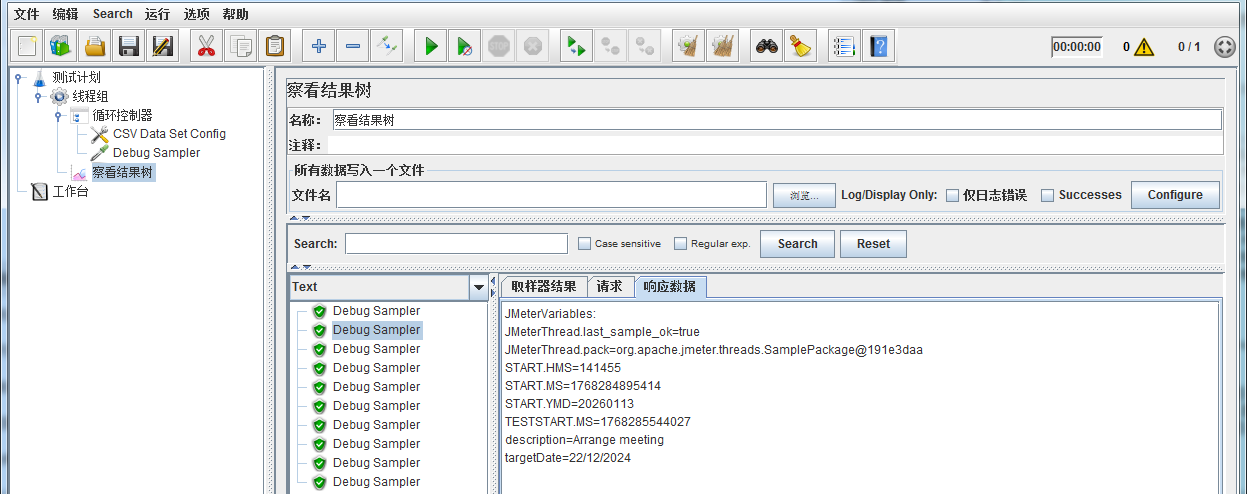 通过Debug Sampler可以看到正确的读取了csv文件中的数据。