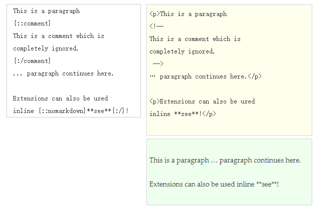 kramdown使用一个通用的语法提供一些较少使用的功能。扩展语法以 {::Tag} 为起始标签,以 {:/Tag} 为结束标签,结束标签可以简写为 {:/}。