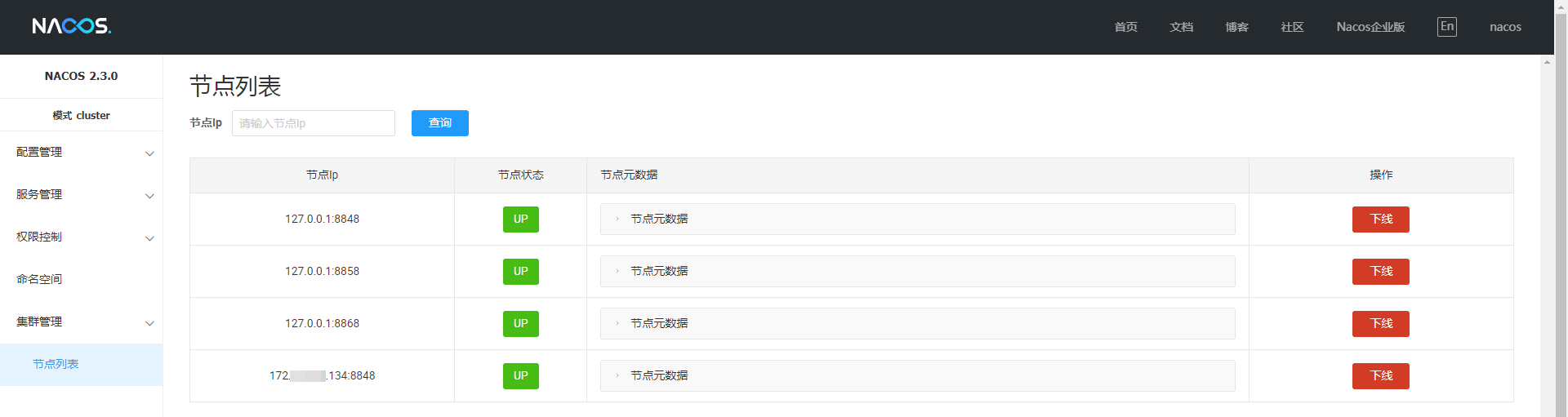 登录后在节点列表中可以看到Nacos节点信息(此处使用同一机器不同端口启动多个Nacos服务):