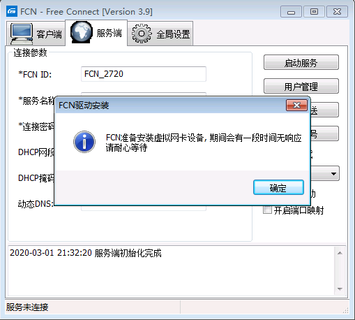 运行fcn_win.exe之后,在服务端页签中设置服务名称和连接密码:
