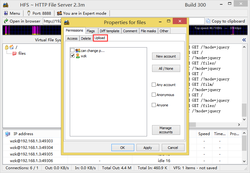 HFS即Http File Server,是一个简单好用的HTTP文件服务器(Web服务器),可以用它来发送和接收文件,也可以把这种文件分享限制在几个朋友之间或向全世界开放。它实际上是一个Web服务器,其他人可以像平时一样通过浏览器(从网站)下载文件。