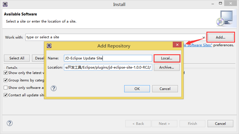 点击Add...,选择解压后的文件,输入Name:JD-Eclipse Update Site: