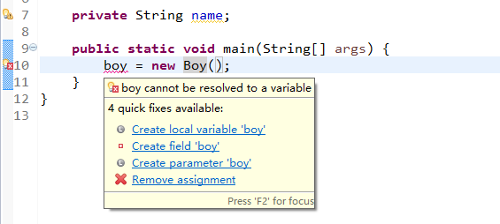 当出现错误时可以将光标划上去或使用ctrl+1来选择快速修复建议。