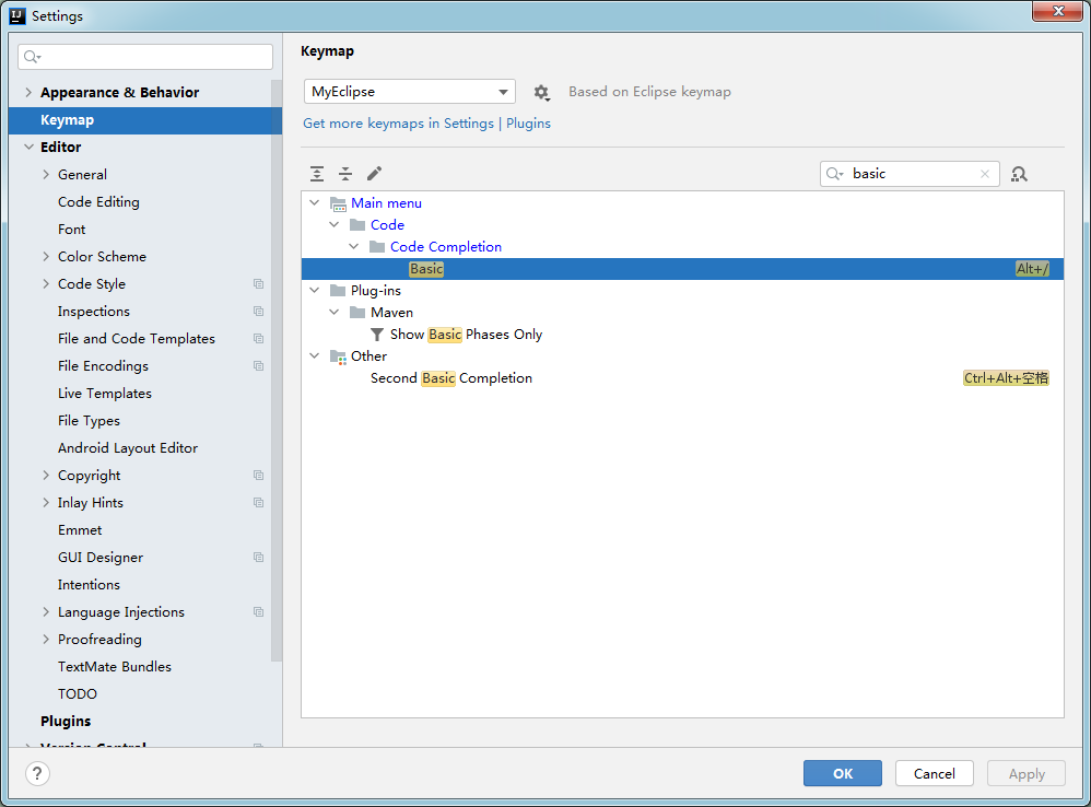 例如将IDEA的Basic Code Completion快捷键:Ctrl + Space改为Eclipse中Content Assist快捷键Alt + /: